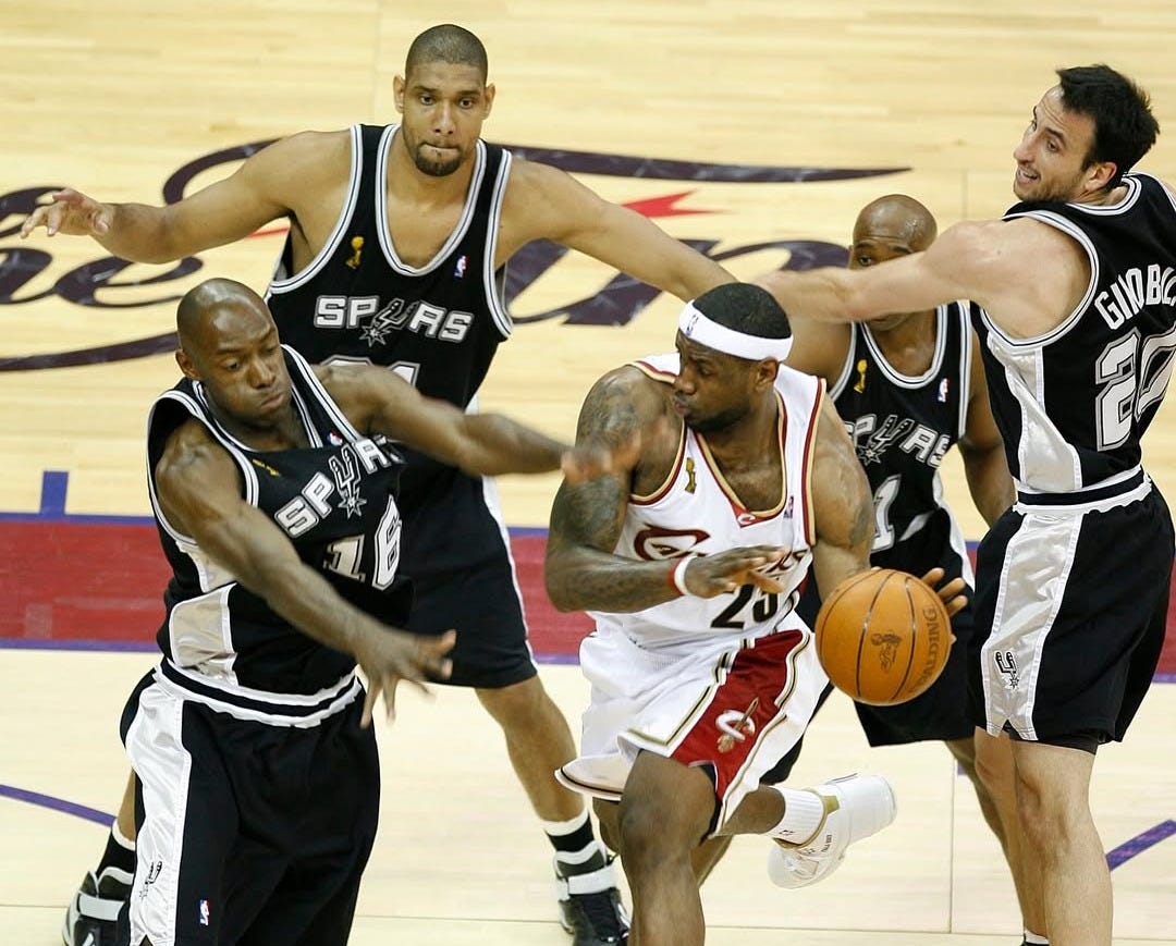 Perception of LeBron James over the years would be directly and inversely related to how much superstar help he had—a hero when he stood alone, a coward when he sought support. Dirk Nowitzki’s standing was tied to whether or not his shot was falling—a laughingstock for his 2007 playoff collapse, but our absolute huckleberry in the Mavericks’ 2011 title run. In the same way, Tim Duncan and the steady Spurs’ reputation depended entirely on the quality of their opponent. During the league’s fallow periods, their dark, colorless jerseys might as well have been a black hat, but whenever new dynasties threatened competitive balance, that silver star in their logo would start to gleam with the righteous authority of a sheriff’s badge again.