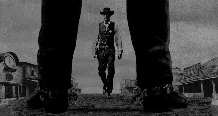 Many classic westerns riff on the theme of one righteous man cleaning up a town plagued by outlaws, but perhaps no movie emphasizes, bolds, and capitalizes ONE RIGHTEOUS MAN like 1952’s High Noon. Gary Cooper plays Marshal Will Kane on the precipice of retirement, preparing to ride off into the sunset with Grace Kelly. His plans are disrupted when he learns Frank Miller, a dangerous criminal he’d put behind bars, has been released and is due to arrive in town with his gang for revenge at high noon. For most of the runtime, Kane searches the town for anyone willing to stand and fight with him. The judge who convicted Miller flees. His own deputy quits. When Miller and his gang finally roll into town, Kane alone goes out to meet them. He guns them down one-by-one, drops his badge with a resounding thud, takes one last withering look at the cowards who’d left him out to dry, and leaves town for good.